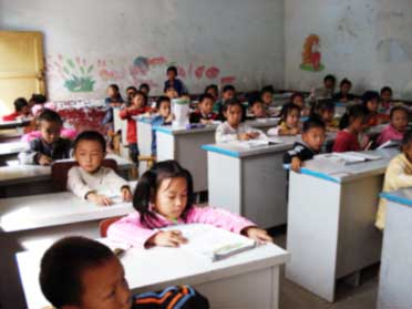 鹽井學校的學生用我校捐贈的課桌椅上課。