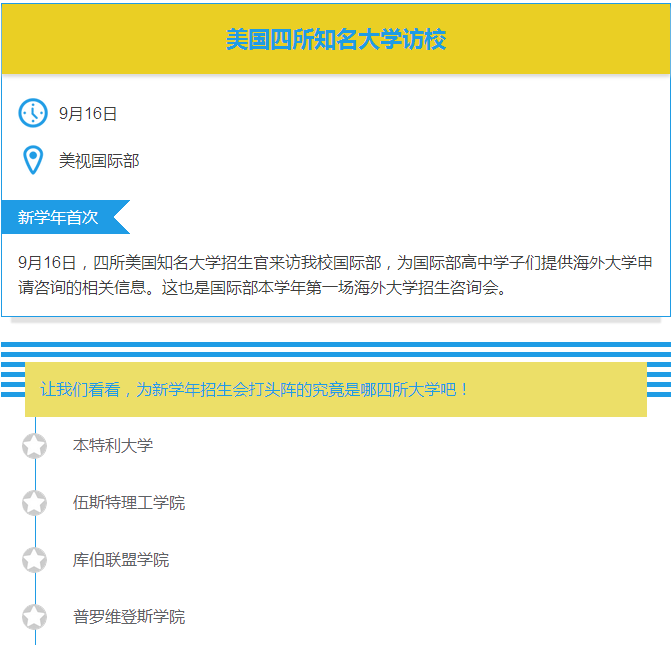 本次大學招生咨詢會是本學年第一次融合部全體高中生參加的大學咨詢會。在接下來的數月里,來自多所海外大學的招生官將陸續到訪我校,為學生們提供更多的海外大學申請方面的信息。我們相信,在不久的將來,本屆融合部畢業班的學生們定能在兩位升學指導老師的指導下獨立完成大學申請,并拿到心儀海外大學的通知書,我們拭目以待吧!
