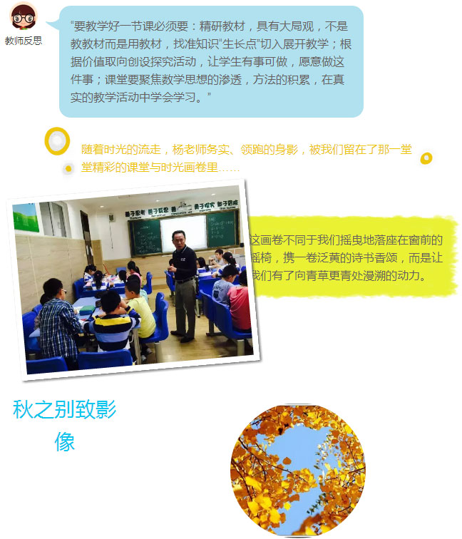 機智溫暖的話語,讓課堂上的每一個孩子都忘了他是我們的校長,只會大聲地叫上一聲“楊老師”。“楊老師,您好久沒給我們上課,我們想聽您上課了……”簡單的對話,發自內心的邀請,讓我們又有了一次進入楊老師課堂學習觀摩的機會。