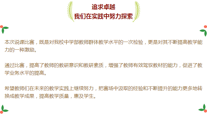 參賽教師們都把此次比賽當(dāng)做一次鍛煉、學(xué)習(xí)、提高的好機會,對說課細(xì)節(jié)進行了認(rèn)真準(zhǔn)備和精心設(shè)計。比賽現(xiàn)場,他們獨具特色、各顯神通。有的娓娓道來、親切溫馨;有的激情滿懷、振奮人心;有的板書規(guī)范、揮灑自如。