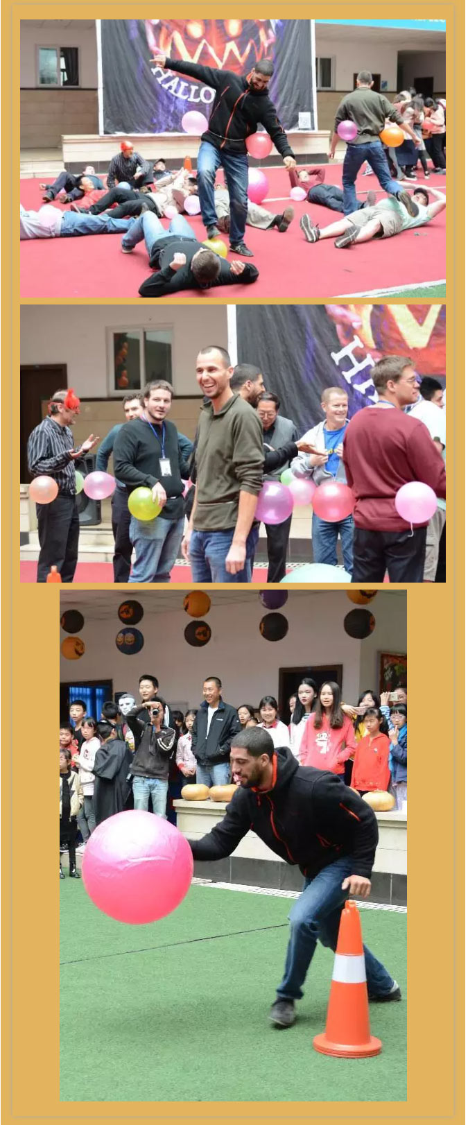 每位老師的身上綁著兩個氣球,他們不能用手而要把氣球弄破。看著老師為了爭取時間“狼狽”的樣子,大家一邊喊著加油,一邊捂著嘴笑開了懷。當然我們聰明的老師也會有自己的辦法,全體臥倒,一個人順著踩過去,氣球自然就破了。聽著“啪啪啪”的聲響,真像是過年的禮花呀。