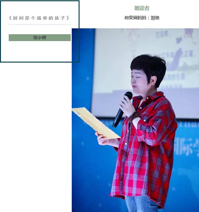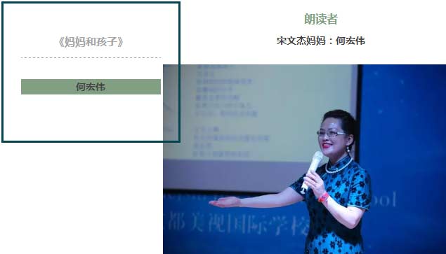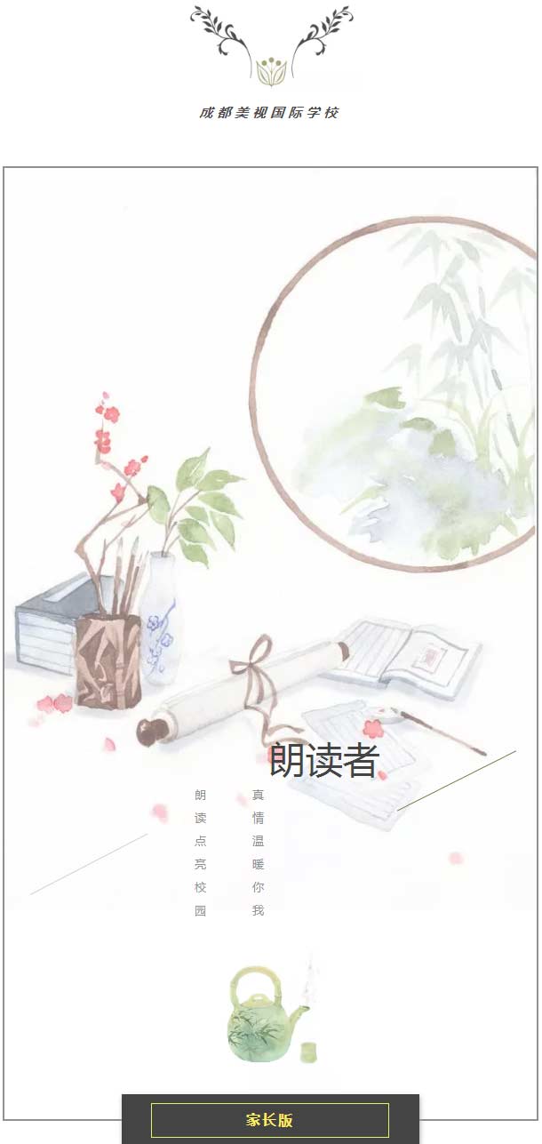 親愛的朋友,你有多久沒有大聲朗讀了? 你是否還記得當年讀過的課文,抄寫過的詩歌? 你是否有許多話,默放心頭,不知該怎樣講給孩子聽? 在詩意繽紛的美視校園,朗讀的熱潮正悄然涌動,心靈的大門已為你敞開...... 我校IB-MYP項目《美視朗讀者》第二期(家長版)邀您品悟。 也許我們平時看到的爸爸媽媽都是忙碌的、威嚴的,甚至焦頭爛額的,而捧著書本為我們朗讀的父母,又是記憶中怎樣一副溫暖的模樣? 久違了,那個床前燈下的“童話大王”! 久違了,朗讀的父母 特邀主持人 葛江虹 美視學子黃瀟漢的母親,曾任重慶電視臺節目主持人、導演。 她專業的現場培訓、親切的主持風格吸引了現場所有觀眾。 情到深處她也不禁潸然淚下,讓我們看到了作為主持人和作為母親的真情流露。 何奕嫻媽媽劉艷來自三線建設家庭,從小就有良好的普通話基礎,也因此獲得了很多登臺表演機會,她小時候看電影特別喜歡秀蘭·鄧波爾的配音演員劉純燕,就一直夢想成為一個配音演員。 《時間是個孤單的孩子》,何媽媽字正腔圓、情真意切的朗讀讓會場迅速充滿了濃濃的文藝氣息。 媽 媽 的 話 參與的過程和結果都很圓滿,這個恐怕是IB教學的魅力所在,不是孩子一個人在奔跑,父母也在追趕學習。 一捧起泰戈爾的詩集,陳薪竹媽媽馮韻璇就發現《開始》一詩像極了自己和女兒,是女兒的降生帶給自己作為年輕母親的開始,也是女兒的成長伴隨自己成長為三個孩子的優秀母親。 作為幼兒園園長的陳媽媽娓娓道來,夢想成為作曲家的女兒陳薪竹現場鋼琴伴奏,母女的完美配合溫情演繹了泰戈爾筆下的親子之美。 媽 媽 的 話 回家就迫不及待的跟爸爸分享了今天的活動,滿滿的都是愛和感動,媽媽們都太優秀了!特別是唯一的“爸爸”,滿滿的正能量,向你們學習! 高爾基的《海燕》是朗讀作品中的經典之作,并且還需要足夠的力量和勇氣來展現。 性格直爽的蘇適媽媽胡蓮希望通過這篇文章的朗讀傳遞給自己的兒子責任、堅強和毅力。 相信不僅是蘇適,在座的所有同學聽到蘇媽媽滿懷激情的朗讀后,都能體會到母親的一片心意。 媽 媽 的 話 我是一個從來不喜歡上舞臺的人,其實上去了也沒那么緊張。我想告訴孩子,朗誦需要技巧,想讀好,要下功夫多練習。 作為一名優秀的小學教師,宋文杰媽媽何宏偉除了自己的兒子之外還有許許多多其他的孩子。 由于職業關系,和自己的孩子相處的時間很少,反而和學生相處更多的她,一直對自己的兒子感到很內疚,因為還沒來得及陪伴他,他就已經長大成人離開家上大學了。 宋媽媽帶來了兩個學生,把自己創作的《媽媽和孩子》送給遠在外地讀書的孩子。至真至情的朗誦激蕩起在場所有媽媽和孩子的內心,感動的淚水盈滿了每個人的眼眶。 媽 媽 的 話 很高興有這樣的機會,雖然我兒已離開美視四年了,但站在這舞臺上,感覺兒子的高中畢業典禮仿佛就在昨天! 李佩恩爸爸李浪是一名杰出的企業家,也是非常關心孩子成長、時時陪伴孩子閱讀的好父親。 隨著兩個兒子的漸漸長大,和家里人相互了解溝通的時間越來越少,王朔的《致女兒書》正好符合孩子們面臨的青春期問題。 李爸爸希望通過這篇文章讓孩子了解父母心里想的、但又無法說出口的東西。 爸爸的話 多讀書 張靜文媽媽樂萍是位用心的全職媽媽,從小的陪伴與鼓勵給孩子帶來了積極樂觀的性格,如今,自信而懂事的孩子鼓勵媽媽報名參加《美視朗讀者》,為媽媽選擇文章,甚至根據現場情緒和氣氛即興鋼琴伴奏! 《成長路上好爸媽》道出了全天下父母的心聲,母女的完美配合也生動展現了親子關系融洽的最高境界。 媽 媽 的 話 能站在《美視朗讀者》舞臺上朗讀,內心是滿滿的感恩和感動!雖然我不專業,卻真實表達了我的內心獨白。無條件的去愛我們的孩子,用我們最大的耐心和愛心去呵護她們、教導她們,因為孩子愛我們比我們愛她們更多一點。陪伴才是最長情的告白! 對于陳浩文媽媽呂貴娟,孩子們再熟悉不過了,學校的每一次活動都有她的身影,學校的每一年感恩墻上都有她的名字,班級活動的許多生動的照片都是她的作品。 吳瑛1977年發表的《十里長街送總理》曾經是人們耳熟能詳的作品,也是緬懷鞠躬盡瘁的周總理的佳作,陳媽媽選擇這篇文章,就是希望孩子們不要忘記歷史,也希望自己的孩子能成為一個有用的人、一個對社會有貢獻的人、一個能推動社會發展的人。 媽 媽 的 話 請相信,事在人為!只要你肯往前走,路一直都在!朗讀者,讓你能敞開心扉跟著文字去感受與理解! 楊楊世成媽媽楊嵐女士是孩子們口中特別溫柔、特別有耐心的媽媽。可就是這樣的媽媽,孩子有時也會嫌她啰嗦、嘮叨。 楊媽媽選了史鐵生的《秋天的懷念》,想通過這篇文章讓孩子們體會到媽媽的嘮叨是什么樣的心情,而媽媽沉默之后的孩子又會是如何的傷感和失落,因為沉默一定是代表你已經失去了最愛你的媽媽。 媽媽的話 朗讀——讓你敞開心靈,去感知世界的一切美好! 《愿你》,一封北京的14歲初二女生寫給“親愛的自己”的書信,陽光又溫暖,說出了很多人到中年的人想說的話,也紅遍了網絡世界。 黃瀟漢媽媽葛江虹作為本期最后一位朗讀者,將這封信獻給全場所有人,也希望所有孩子都能在心里給自己的未來畫上一幅美麗的藍圖。 媽媽的話 閱讀是由外向內的,朗讀是由內而外的,朗讀由此融入了更
