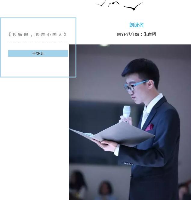 八年級的朱青柯同學朗讀的篇目是當代詩人王懷讓的代表作品《我驕傲,我是中國人》。