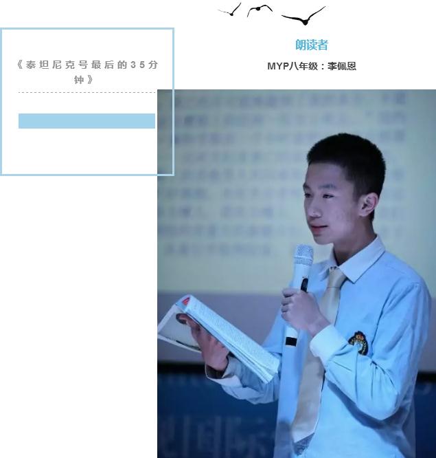 八年級的李佩恩同學的爸爸參加上一期家長版《美視朗讀者》的時候,原本選擇了一篇《泰坦尼克號最后的35分鐘》,后來在兒子的建議下更換了朗讀篇目,而兒子又將父親選擇的文章讀進了學生版的現場。