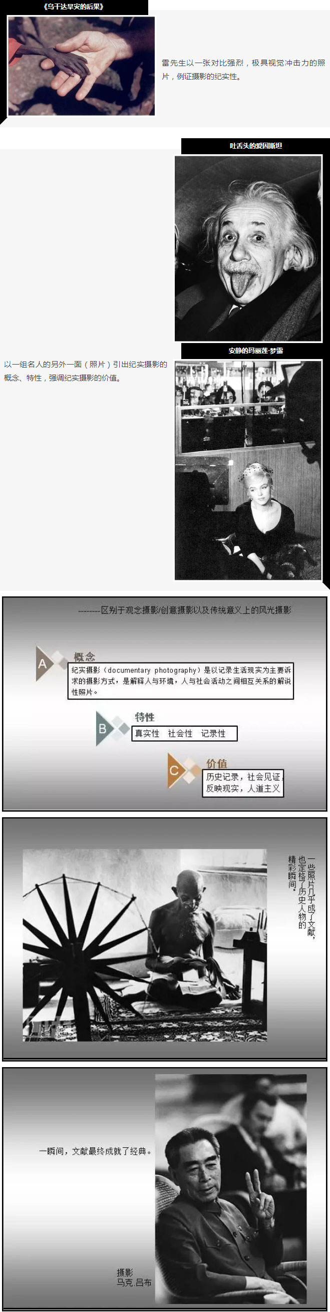 攝影史上那些杰出的大師 接著,雷先生介紹了攝影史上那些杰出的大師們。 雷先生坦言,他迷上攝影,緣起于在大學(xué)圖書館看到了布列松的攝影圖片集。那一刻,那些圖片讓他震撼,以至于讓學(xué)新聞立志“寫文字的”的他決定“棄文從影”,從此投身入攝影世界。與魯迅先生棄醫(yī)從文不同,與丁肇中聽了老師的講座,改變了專業(yè)方向有異曲同工之妙。 我們崇敬那些人生路上的引領(lǐng)者,教師的工作魅力也正在于此。也許你不經(jīng)意間的一堂課、一段話,在學(xué)生心中播下了一顆種子,在你所不知道的時(shí)間地點(diǎn),開花結(jié)果。