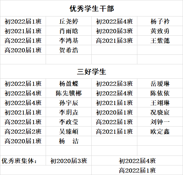 經兩輪張榜后,學校評優領導小組充分聽取各方意見并結合學生學習、管理、常規等方面表現,研究決定推薦以下20位同學參評高新區優秀學生干部、三好學生及3個優秀班集體,特此榜示!