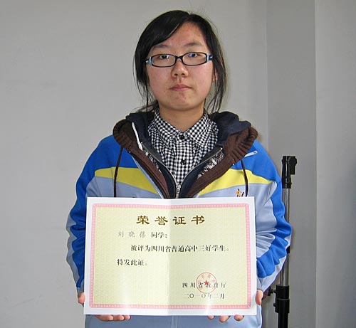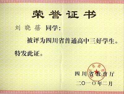 劉曉蓓同學榮獲四川省普通高中三好學生