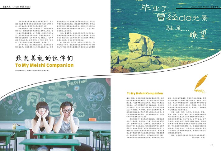 4001百老匯星空藝術(shù)團(tuán)、籃球隊(duì)、話劇社、文學(xué)社、配音社、模型社、繪畫社、校園廣播站......,揮灑著我們關(guān)于青春的夢想;自辦報(bào)社《4001百老匯少年說》、心理期刊《心之憩園》,展示著我們的思想氣度;辯論賽、藝術(shù)節(jié),演繹著我們的激情飛揚(yáng)。