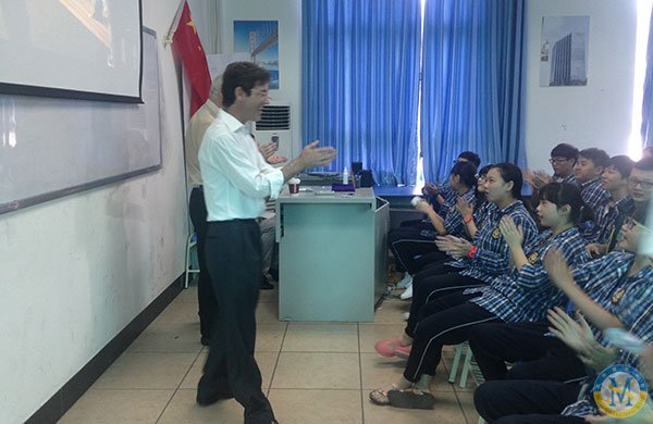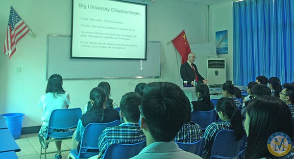2015年5月29日上午,來自美國普利茅斯州立大學商學院的院長Boggess 來到美視中美英才班,在選擇大學的方面給高一高二同學們分享了一些見解與看法,同時也邀請了兩位在PSU學習的校友為同學們介紹普利茅斯州立大學。