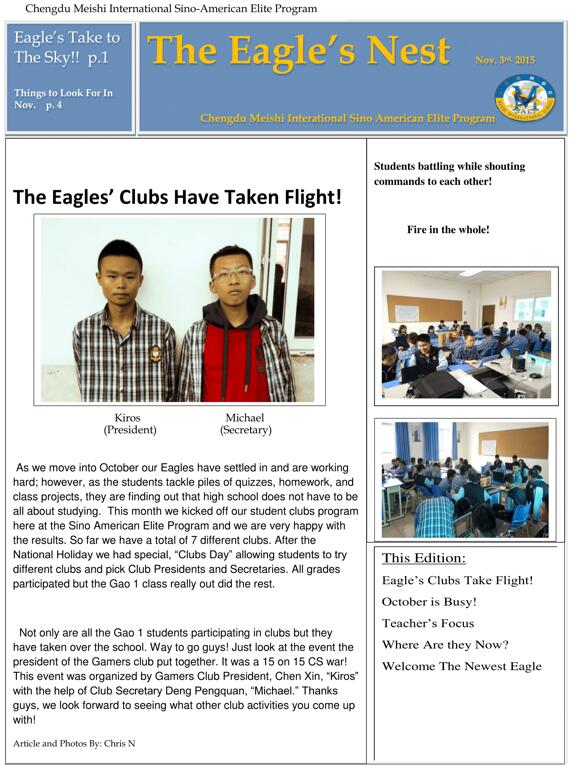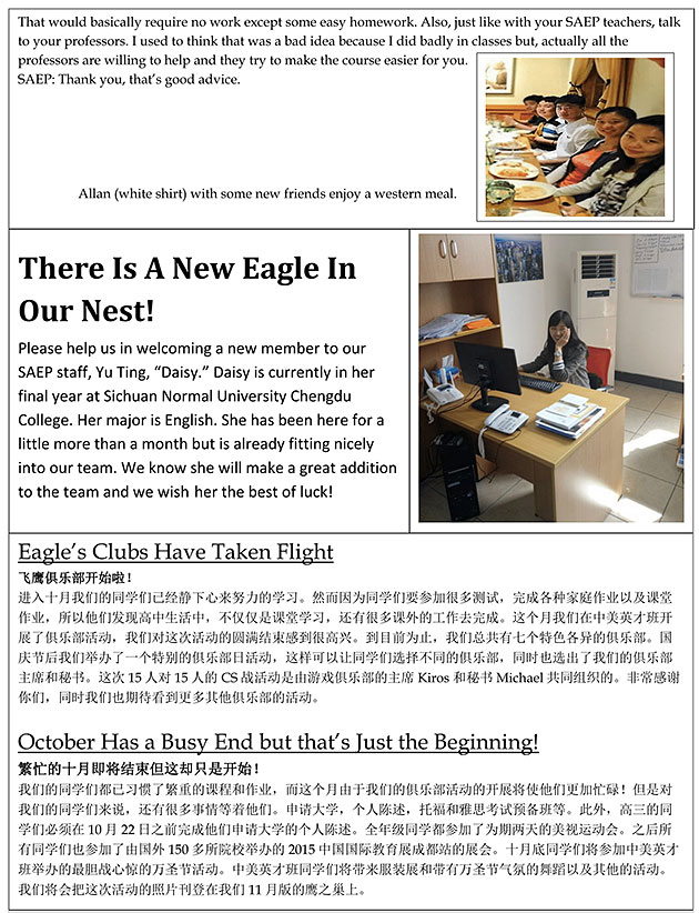 我們的同學們都已習慣了繁重的課程和作業,而這個月由于我們的俱樂部活動的開展將使他們更加忙碌!但是對我們的同學們來說,還有很多事情等著他們。申請大學,個人陳述,托福和雅思考試預備班等。此外,高三的同學們必須在10月22日之前完成他們申請大學的個人陳述。全年級同學都參加了為期兩天的美視運動會。之后所有同學們也參加了由國外150多所院校舉辦的2015中國國際教育展成都站的展會。十月底同學們將參加中美英才班舉辦的最膽戰心驚的萬圣節活動。中美英才班同學們將帶來服裝展和帶有萬圣節氣氛的舞蹈以及其他的活動。我們將會把這次活動的照片刊登在我們11月版的鷹之巢上。