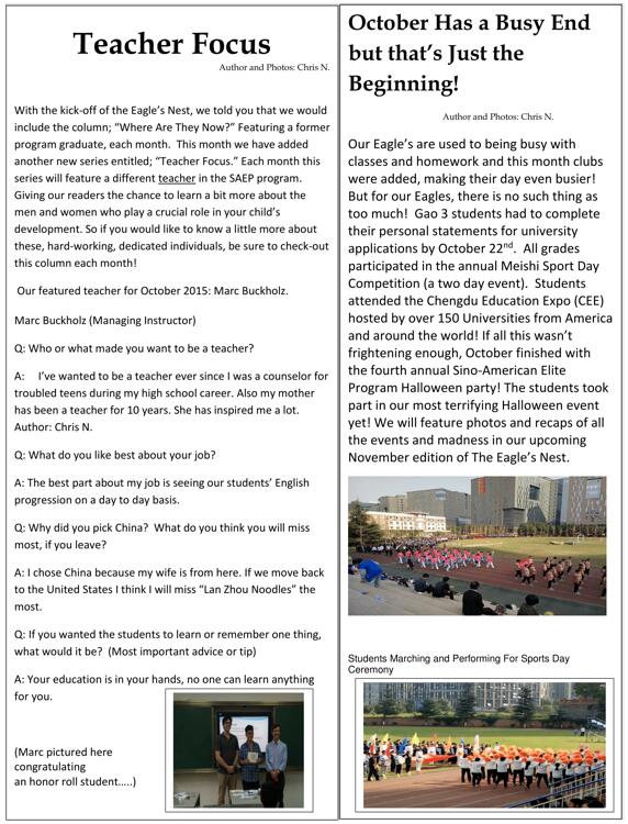 在我們的鷹之巢的創始之初,我們有一個專欄叫“他們在……”,在這上面我們每個月都會向大家介紹一位我們中美英才班的畢業生。從這個月開始我們開設了一個新版塊“教師關注”。每個月我們都會專訪一位中美英才班的老師,讓我們的讀者對我們的老師有更多的了解。所以如果你們想要了解更多,敬請關注我們這一新版塊!我們2015年10月的專訪教師是Marc Buckholz.