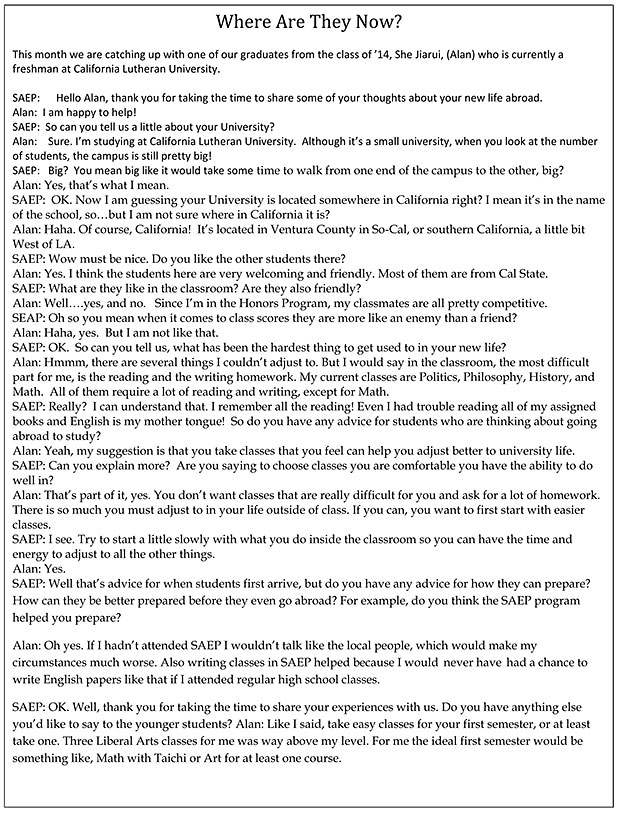 本月我們訪問到了來自2014屆的畢業生Alan佘家瑞,他現在是加州路德大學的一名大一新生。