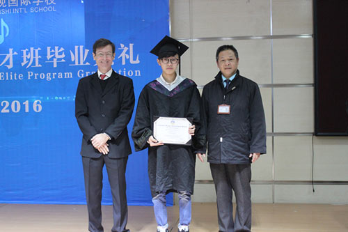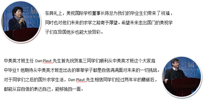 2016年1月19日,在國際部禮堂舉行了第三屆中美英才班畢業典禮,大家在此齊聚,共同為即將告別高中時代的畢業生們送上最真摯的祝福。 別離,是有點難舍,但不是悵然; 是有點遺憾,但不是悲觀,因為我們有相逢的希望在安慰,因為我們知道離別是為了更好的相遇,為了遇見更好的自己。