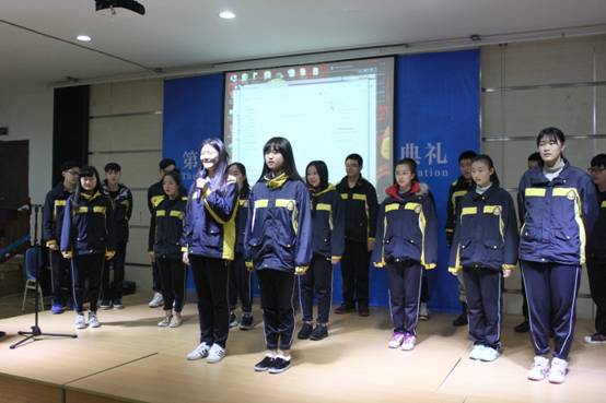 高一(1)班的同學們為大家獻上了一首動聽的歌曲,他們對學長學姐們的美好祝愿此時都化作美妙動聽的音符,縈繞整個禮堂。
