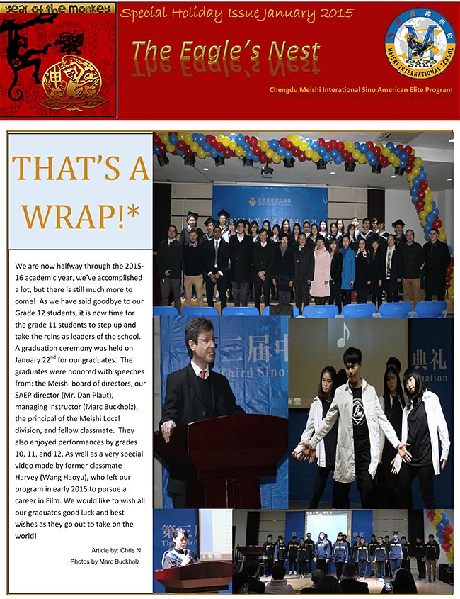 2015-2016學年已過去一半,我們圓滿完成了許多事情,但還有更多等待著我們。告別了高三的同學們,現在輪到高二同學們開啟他們的高三生活了。2016年1月19日,我們舉行了第三屆中美英才班畢業典禮。美視學校董事長陳總,中美英才班主任Dan Plaut先生,中美英才班首席教師Marc Buckholz, 美視中學部校長徐德雄先生分別為畢業生們送上了祝愿。在典禮上,中美英才班畢業生代表分別表達了他們的感激之情。此外,大家還欣賞到了由高一,高二,高三同學為大家準備的節目。Harvey Wang和 Sophie Zhang 也為此次畢業典禮制作了一段特別的視頻。我們衷心祝愿高三畢業生們國外生活一切順利。