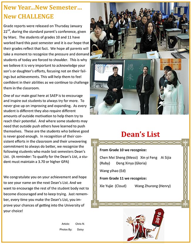 在1月22日星期四召開的家長會上,中美英才班首席教師Marc Buckholz已將同學們的成績單分發到了各位家長手里。在過去的一學期里,高一和高二的同學們認真努力地學習,同學們的成績單就是最好的說明。我們希望所有家長們能明白同學們所承受的壓力。這就是我們為什么相信,認可您孩子的付出和努力是非常重要的,不要只看到他們的失敗,還應看到他們的成功。因為這將有助于增強他們的信心,以便能更好的應對學習中遇到的困難和挑戰。