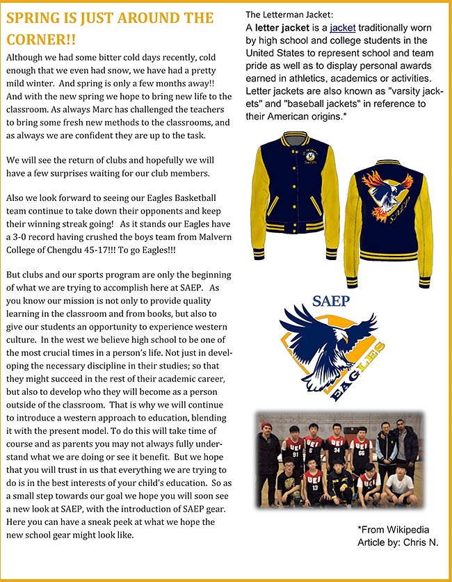 中美英才班俱樂部和體育隊只是我們一直所做的開始。正如你所了解的,我們的目標不僅僅只是在課堂上提供優質教學,還有提供讓同學們體驗西方文化的機會。在西方,我們認為高中時代對于一個人的一生來說是最重要的時期之一。不僅僅是培養他們必要的學習習慣,保證順利完成之后的學業,還有讓同學們了解自己在課堂之外想要成為怎樣的人。這就是我們為什么要繼續將西方的方法引入我們的教學當中,變成適合我們自己特色的教學模式。我們所做的都需要時間來證明,有的家長可能不能完全理解我們現在所做的或者看不到有益的東西。但我們希望各位家長給予信任,因為我們現在所做的一切都是有益于您孩子的學習成長。向著目標前進的每一小步都是希望家長們以后看到一個不一樣的中美英才班。