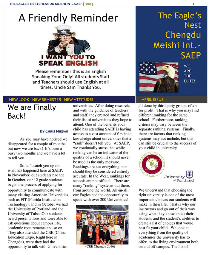 對于高一和高二年級的同學(xué)們來說,接下來的日子也并不輕松。雖然離他們的大學(xué)申請還有一兩年,但從現(xiàn)在開始了解、準(zhǔn)備也是有必要的。我們也鼓勵同學(xué)們了解自己的興趣所在以及思考自己未來將要選擇什么專業(yè)。同時,我們也希望父母與同學(xué)們共同參與到大學(xué)申請中來,為孩子選擇最好的教育是每個父母的心愿,但一些家長卻認為只需要將孩子送進去,其他事情就交給學(xué)校負責(zé)。我們希望家長懂得事情遠不止這樣簡單。對于高一的家長,我們鼓勵您參與到孩子的學(xué)習(xí)過程中去,并且起到督促、引導(dǎo)的作用。