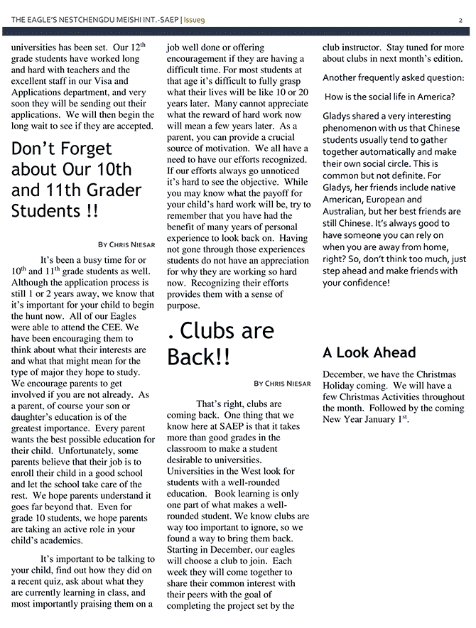 國外大學(xué)希望所招收的學(xué)生是綜合全面發(fā)展的。但書本知識只是全面發(fā)展的一個組成部分。課外實踐活動也是不可或缺的,而通常學(xué)生俱樂部的重要性卻往往容易被忽視,所以我們盡最大努力讓它繼續(xù)開展下去。從12月開始,同學(xué)們將自由選擇一個感興趣的俱樂部加入。每周,擁有共同興趣愛好的同學(xué)將一起完成由俱樂部老師安排的項目。更多俱樂部信息,請關(guān)注下期鷹之巢。