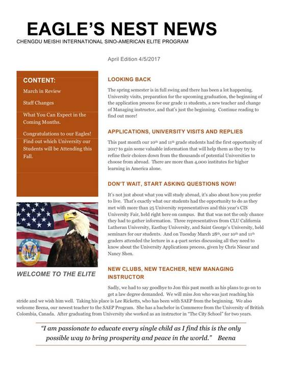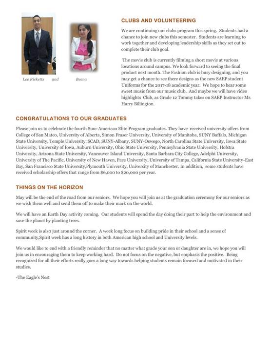 隨著春季學(xué)期的開始,中美英才班又有哪些新鮮事兒呢?多所國(guó)外大學(xué)來(lái)訪中美英才班、2017屆畢業(yè)生畢業(yè)典禮、高二同學(xué)們的大學(xué)申請(qǐng)、新外教的加入等等。