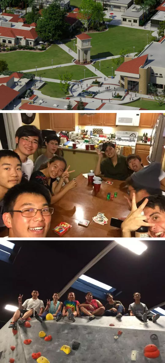 Tommy說每天自己準備早晚餐,跟室友相處也很好,大家每周四會開車出去攀巖、打網球、聚餐等等。在學習方面,Tommy告訴我們作業一般提前一兩天做完,通常每天做做作業到晚上十點左右。在選課方面,學校會根據你的目標建議你選修的課程,比如準備轉加州州立大學的,或加州大學其他分校的,或者美國其他大學的,會根據不同學校的要求和自身情況推薦課程,自己也會去找課程顧問商量選修何種課程。目前Tommy在上寫作、語法、數學,還選擇了一門沒有學分的課程,就是學習自我管理,時間管理這類的,他現在根據自己的學習安排,按部就班的完成自己的學習任務。他覺得自己很適應,什么都挺好的!