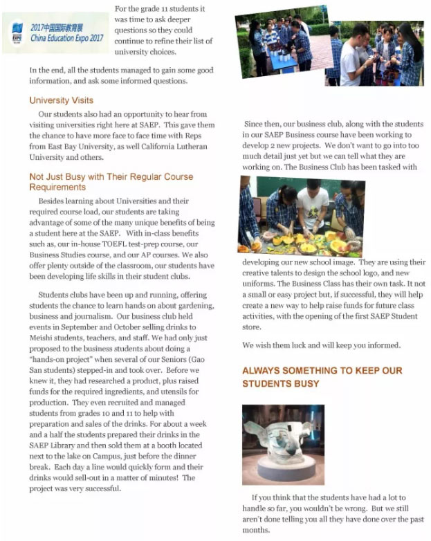園藝、商務(wù)和新聞學(xué)生社團(tuán)的開展,使同學(xué)們有機(jī)會(huì)提升自我動(dòng)手能力。9月和10月,我們商務(wù)社團(tuán)的同學(xué)們?cè)谛?nèi)向同學(xué)、老師們售賣自制飲料。我們只是建議商務(wù)社團(tuán)的同學(xué)們做一個(gè)親身動(dòng)手實(shí)踐的項(xiàng)目。在我們知道這個(gè)項(xiàng)目之前,他們已決定要做何種產(chǎn)品,還為產(chǎn)品所需的原料和機(jī)器籌集了資金,甚至還請(qǐng)高一和高二的同學(xué)幫助他們準(zhǔn)備和售賣飲料。大約一個(gè)多星期的時(shí)間,同學(xué)們準(zhǔn)備飲料,然后在晚飯休息時(shí)間售賣。每天的售賣場(chǎng)面火爆,并且飲料在幾分鐘內(nèi)就售賣一空。此次實(shí)踐項(xiàng)目運(yùn)作非常成功!從那之后,商務(wù)社團(tuán)和商務(wù)課程的同學(xué)們一直在開發(fā)兩個(gè)新項(xiàng)目。商務(wù)社團(tuán)負(fù)責(zé)設(shè)計(jì)學(xué)校標(biāo)志和校服。商務(wù)課程的同學(xué)們也在準(zhǔn)備自己的項(xiàng)目——創(chuàng)辦第一家中美英才班學(xué)生商店。如果項(xiàng)目運(yùn)作成功,那么他們將創(chuàng)建一條為未來班級(jí)活動(dòng)籌集資金的新渠道。希望同學(xué)們的項(xiàng)目能夠順利開展,讓我們拭目以待!