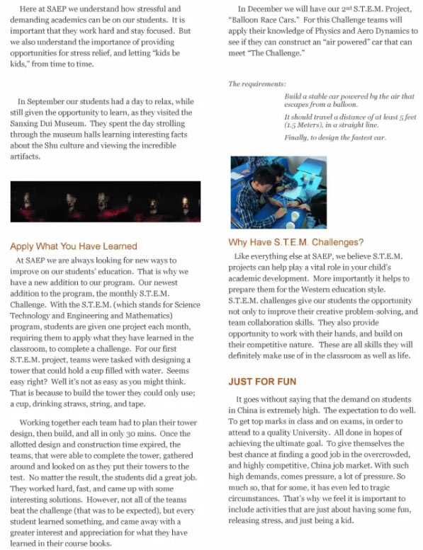 中美英才班一直在尋求提高學(xué)生教育的新方法。 因而我們開設(shè)了一個(gè)新的項(xiàng)目——每月一次的S.T.E.M.(科學(xué)、技術(shù)、工程、數(shù)學(xué))挑戰(zhàn)。每月給同學(xué)們安排一個(gè)項(xiàng)目,要求運(yùn)用他們?cè)谡n堂上所學(xué)到的知識(shí)完成挑戰(zhàn)。第一個(gè)參加S.T.E.M.項(xiàng)目團(tuán)隊(duì)的任務(wù)是設(shè)計(jì)一個(gè)可以放置盛滿水的杯子的塔。聽起來似乎很簡(jiǎn)單,其實(shí)不然,因?yàn)樗麄冎谱魉牟牧现挥幸粋€(gè)杯子、吸管、線和膠帶。