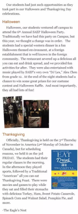 為了將來能夠讓孩子進(jìn)入一所優(yōu)秀的大學(xué)學(xué)習(xí)以及在未來的求職競(jìng)爭(zhēng)中勝出,找到一份好工作,中國(guó)學(xué)生常常被賦有極高的期望,家長(zhǎng)們總是希望他們能夠在學(xué)業(yè)上獲得優(yōu)異成績(jī)。在這樣的壓力下,我們認(rèn)為讓同學(xué)們?cè)诨顒?dòng)中尋找樂趣,釋放壓力是非常重要的。因而我們特意為同學(xué)們策劃了萬圣節(jié)和感恩節(jié)的慶祝活動(dòng)。