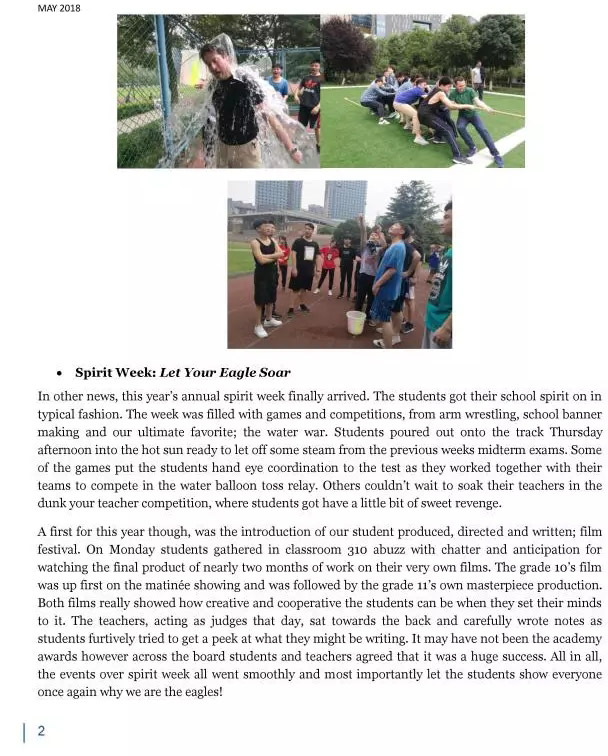今年校園精神文化主題活動周如期開展,在參與中感悟學校精神文化。本屆校園精神文化主題周活動包括:扳手腕比賽、拔河賽、學校海報制作以及同學們最愛的水球大戰。周四下午,同學們齊聚運動場,在活動中釋放學業壓力。鍛煉學生手眼協調能力的水球接力賽,以及獲勝者可獲得“報復”老師機會(往老師身上澆水)的投籃賽,精彩紛呈!