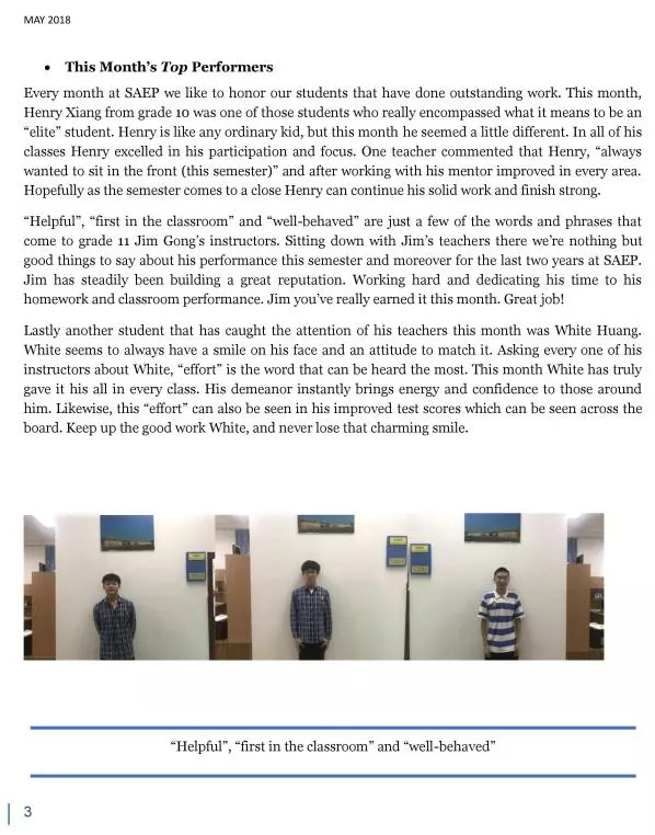 每月,我們都會評選出中美英才班優秀學生。因在課堂出勤以及在上課態度方面表現優異,來自高一的Henry Xiang同學被評為本月優秀學生。一位老師給予Henry這樣的評價,“總是坐在前排的學生”。此外,Henry通過參與一對一同伴輔導計劃,在多個領域都獲得了提升。希望Henry繼續努力保持!