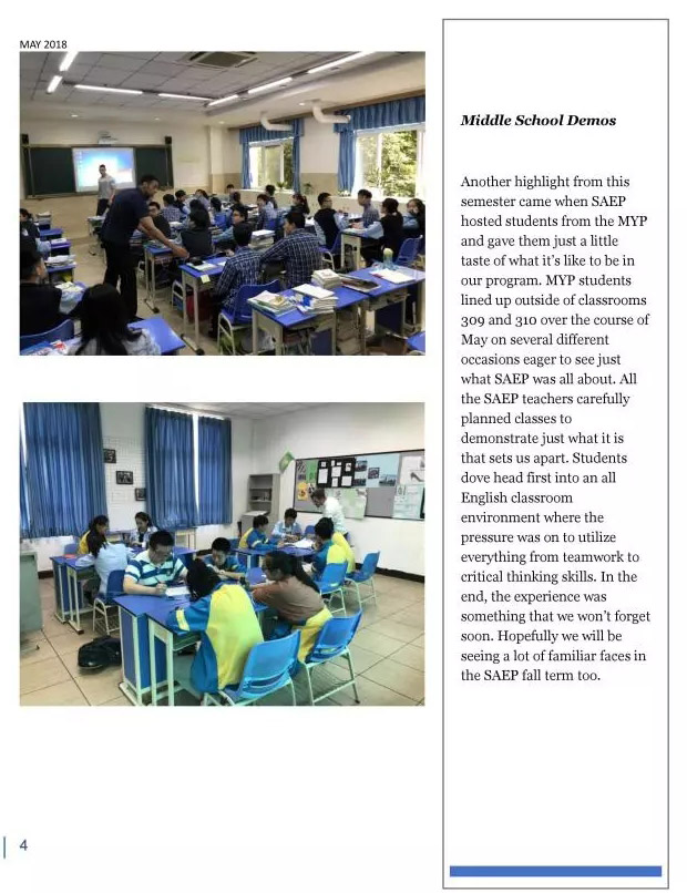 本學期,中美英才班老師為MYP學生上了一堂生動的展示課,旨在讓同學們了解中美英才班的課堂是怎樣的。老師們精心設計課程,以展示中美英才班的與眾不同。同學們沉浸在全英文的課堂環境中,從團隊合作到批判性思維能力,所有這些都給同學們帶來不小壓力。相信這對同學們也是一次難忘的經歷。希望秋季學期,能在中美英才班再次見到這些熟悉的面孔。