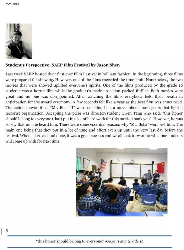今年中美英才班第一屆電影節順利舉行。 電影節上,同學們共同觀看了歷時兩個月親自制作出的充滿創意的電影,他們自導自演、編寫劇本,為籌備電影拍攝投入了許多精力,尤其是高一和高二的同學們展現了突出的創造力和合作精神。老師們擔任評委,評選出了優秀電影作品。