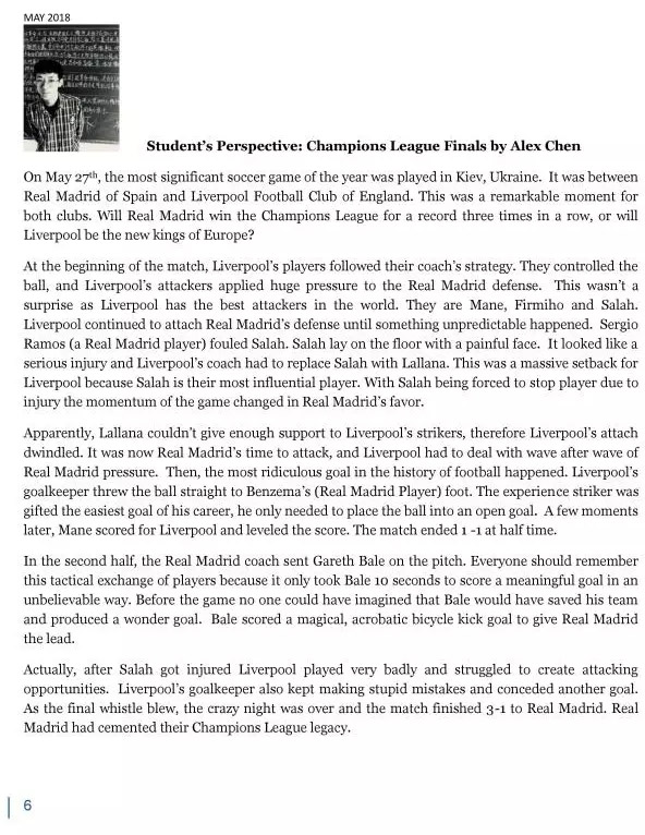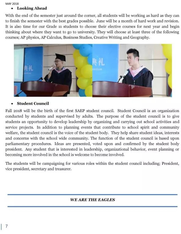 本學期即將結束,所有學生都在為準備期末考試而忙碌。高二學生也將在本月完成下學年選修課的選擇,他們將從AP物理、AP微積分、商務課程、創意寫作和地理這五門課程中至少選擇三門,同時也開始考慮大學申請的相關事宜。